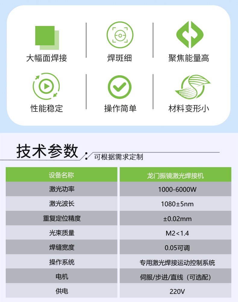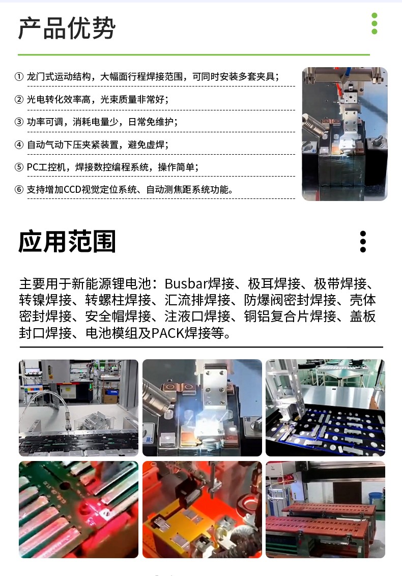 采用光纖連續(xù)激光器、龍門運(yùn)動(dòng)結(jié)構(gòu)、高功率振鏡焊接頭、水冷系統(tǒng)、PC機(jī)控制系統(tǒng)等重要部件集成,具有高功率、精細(xì)光束質(zhì)量、免維護(hù)、高電光轉(zhuǎn)換效率等特性,可進(jìn)行點(diǎn)、直線、圓等任意平面幾何圖形軌跡焊接,是一款高效、安全、穩(wěn)定的高功率光纖激光焊接機(jī),在新能源電池焊接方面表現(xiàn)優(yōu)異,可焊接各種規(guī)格型號(hào)的鋰電池組。