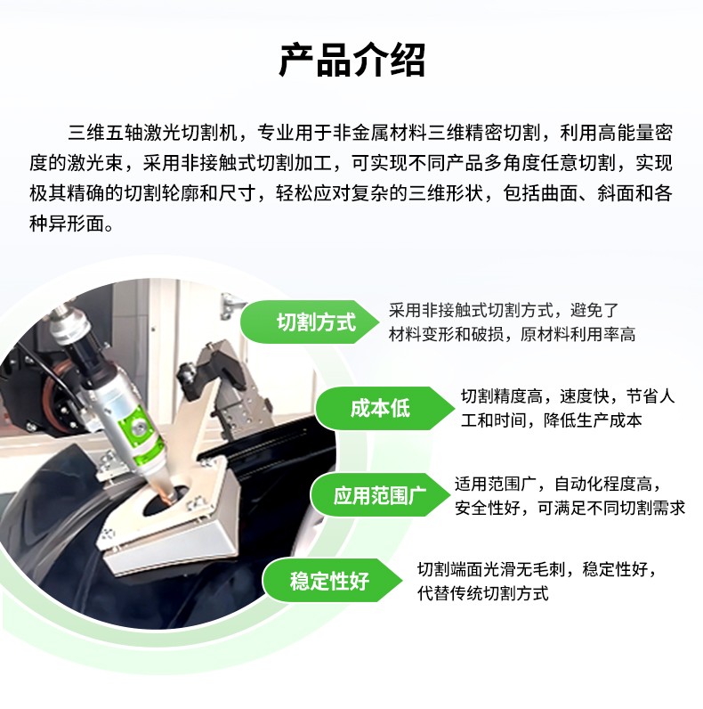 專業(yè)用于非金屬材料三維立體精密切割,可實現(xiàn)不同產(chǎn)品多角度任意切割,實現(xiàn)極其精確的切割輪廓和尺寸,